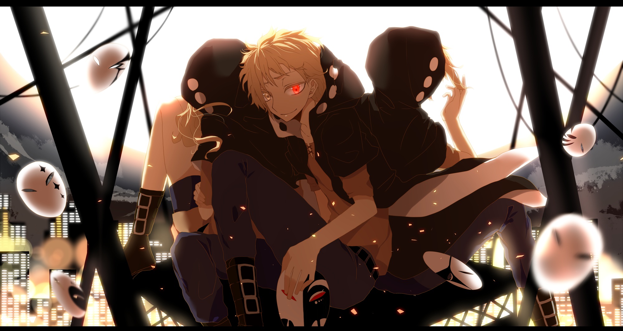 Description: A man and woman sitting in a forest with a city in the background and glowing eyes on their faces.