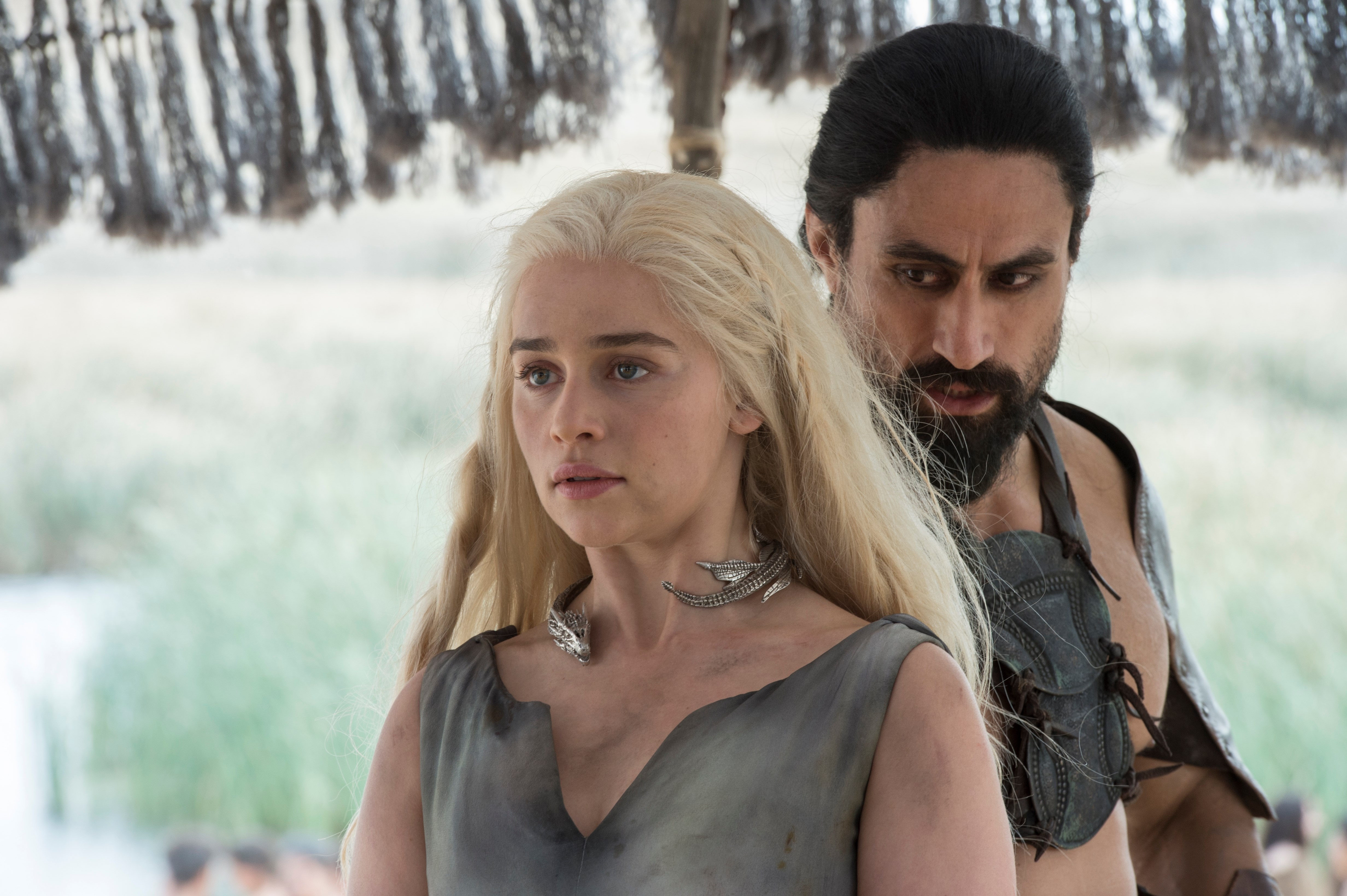Description: A man and a woman standing next to each other in a forest area with a straw roof and grass.