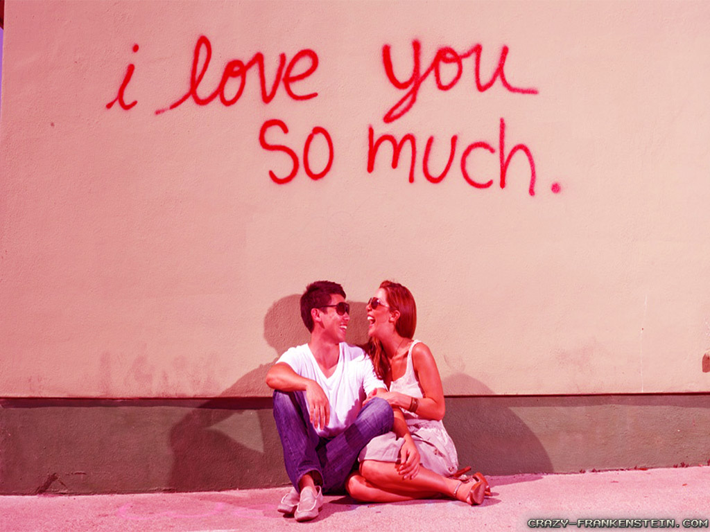 Description: A man and woman sitting on the ground next to a wall with graffiti on it that says i love you so much.