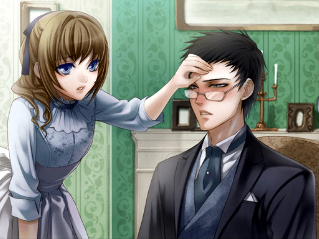 Description: A man and a woman in a room with green walls and a fireplace and a green wall with a green wall.