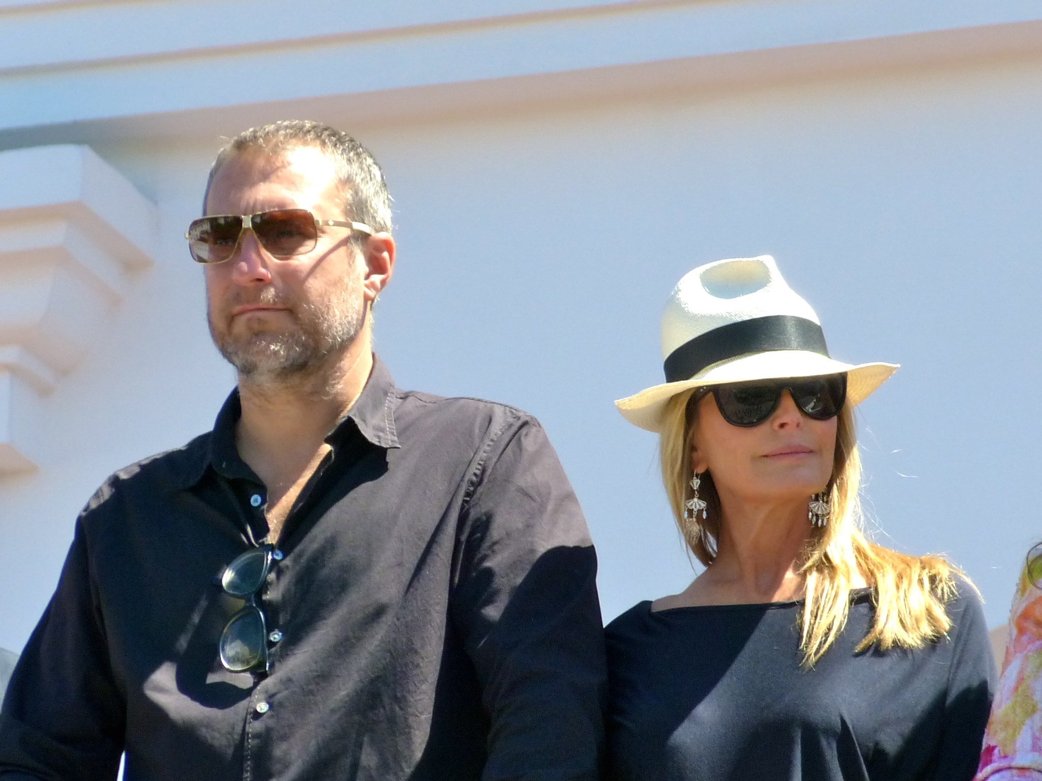Description: A man and a woman wearing hats and sunglasses on a sunny day with a building in the background and a blue sky.