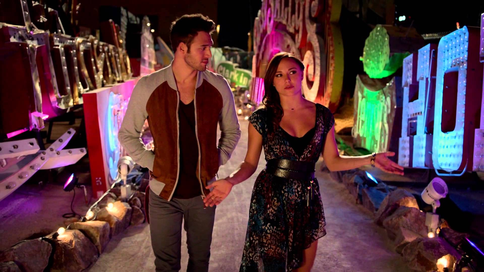 Description: A man and a woman holding hands in front of neon signs and a building with a neon sign on it.