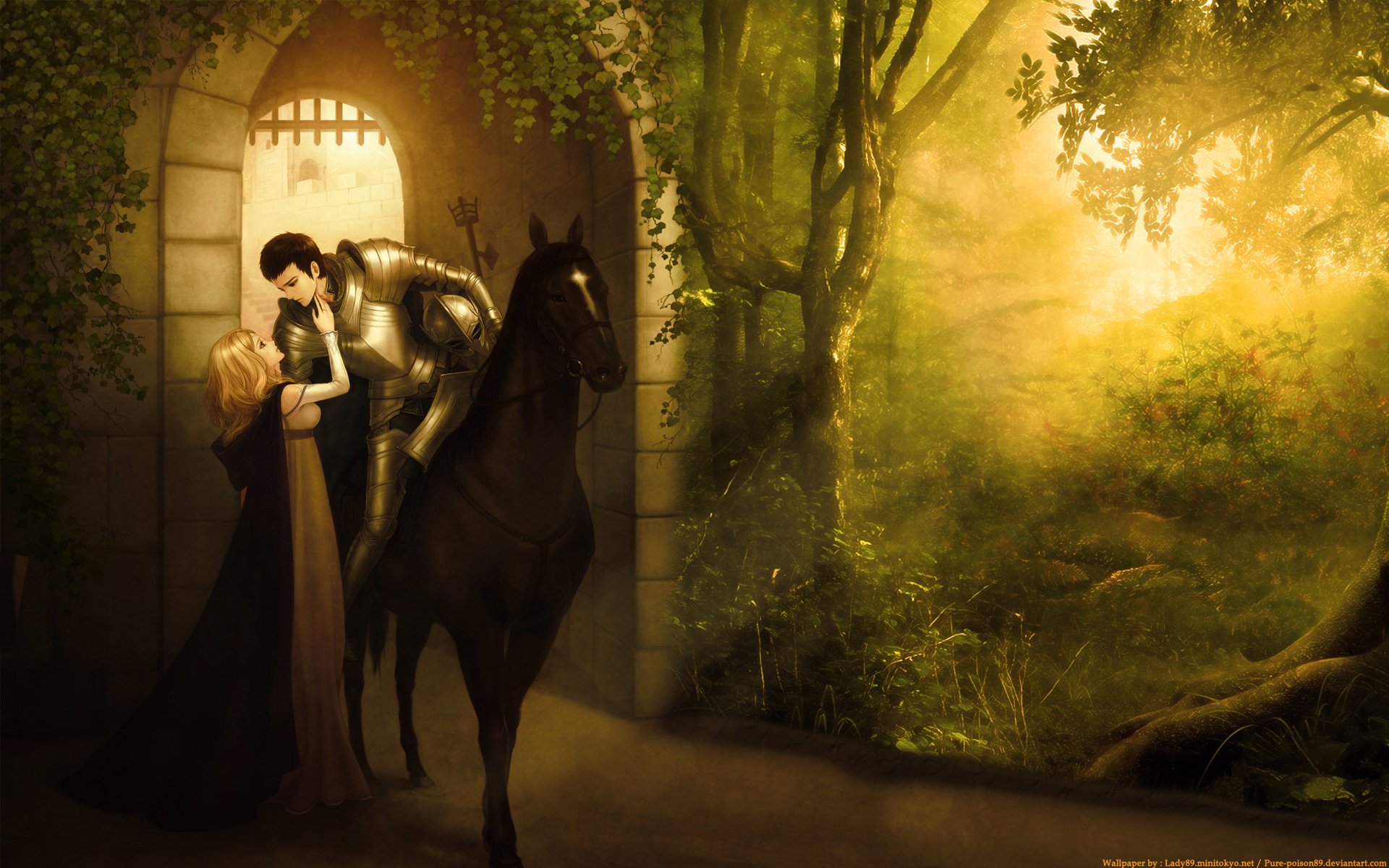 Description: A man and woman are standing next to a horse in a forest with a castle in the background and a light shining on the horse.