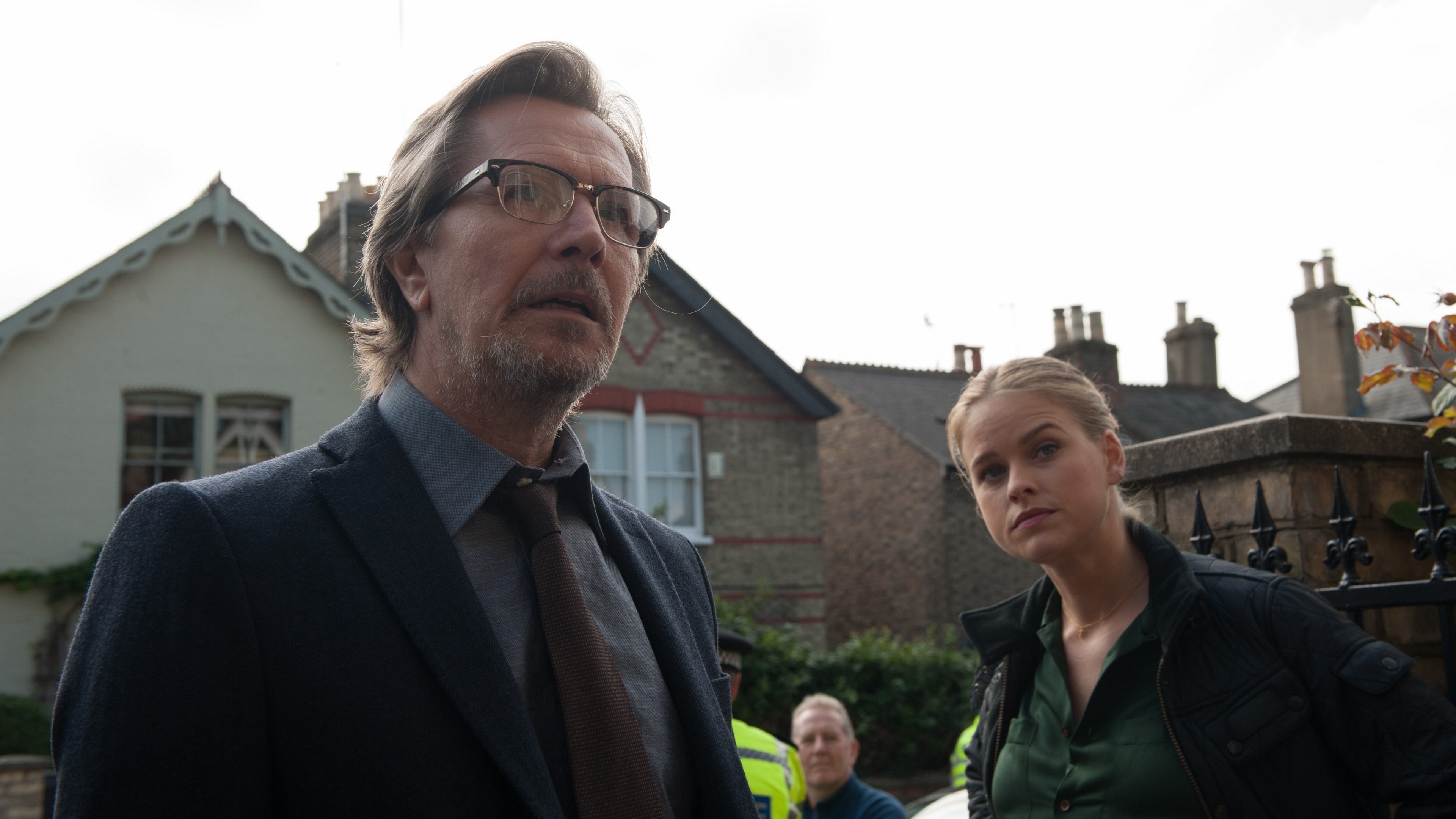 Description: A man in a suit and tie standing next to a woman in a green shirt and black jacket and a house.