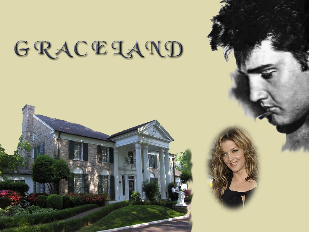 Description: A man and woman are in front of a house with a picture of them and the words graceland.