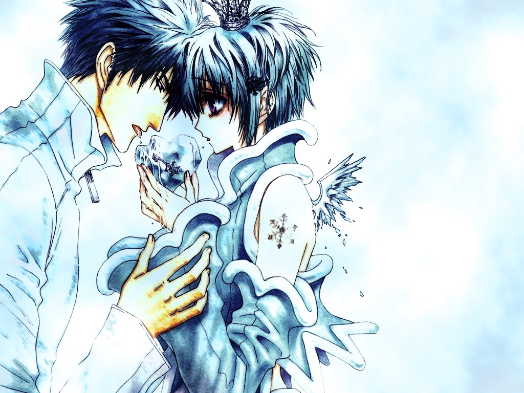 Description: A man and a woman are hugging each other with a skull on their chest and a crown on their head.