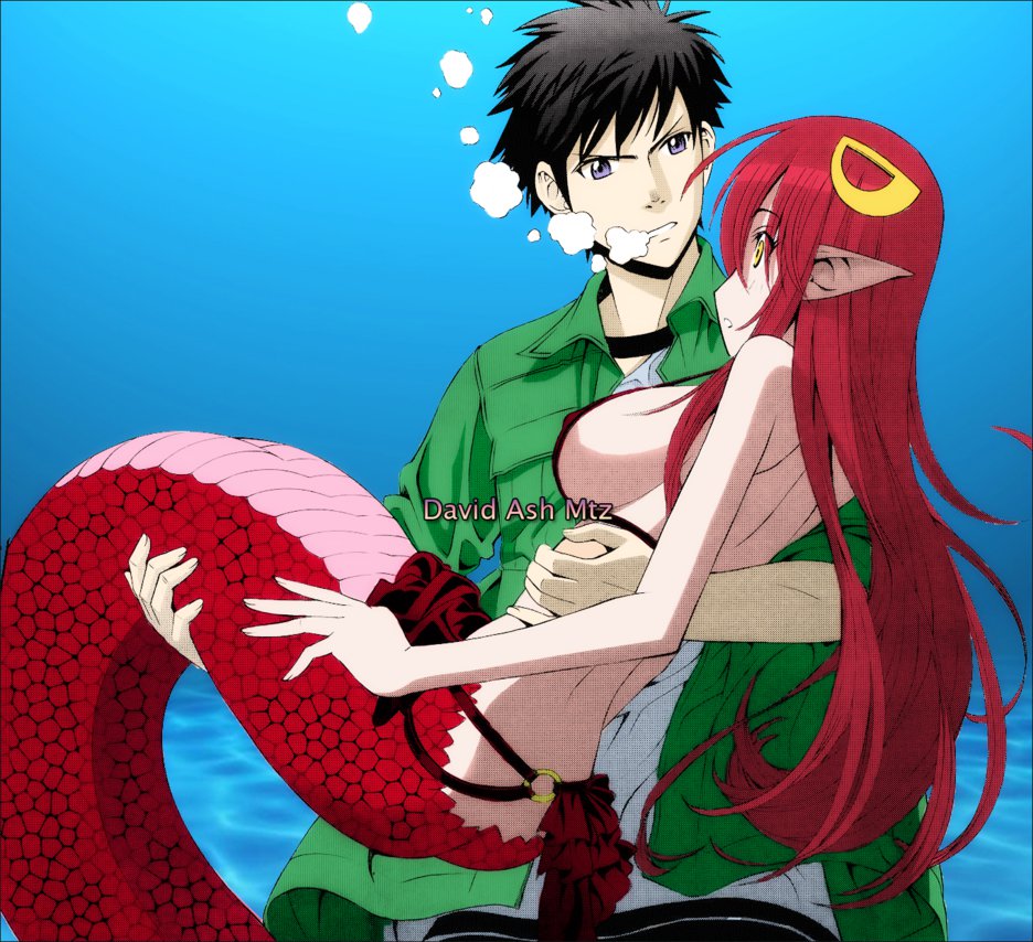 Description: A man and a woman are hugging under the water with a fish in their hands and a fish in their mouth.