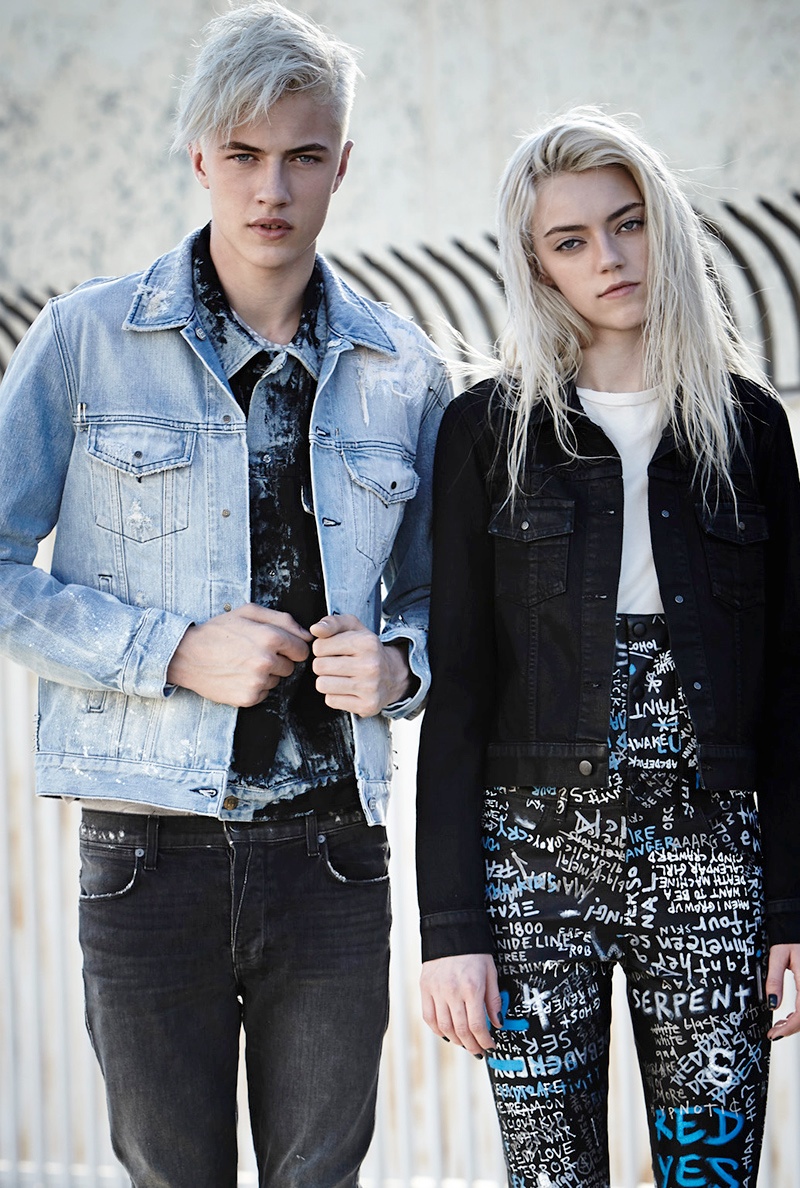 Description: A man and a woman standing next to each other wearing jeans and jackets and jeans on their feet.