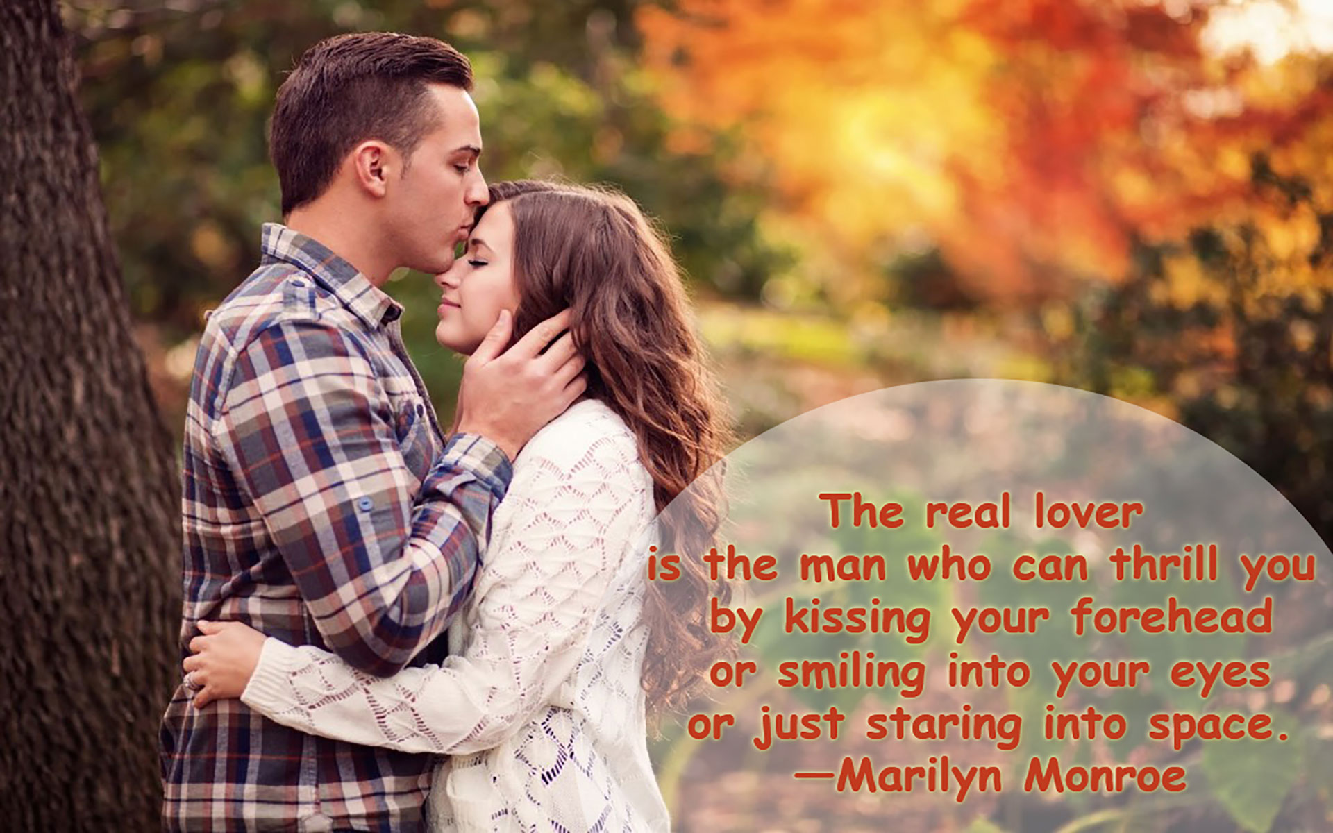 Description: A man and a woman kissing in front of a tree with a quote from marilyn monroe on it that says.