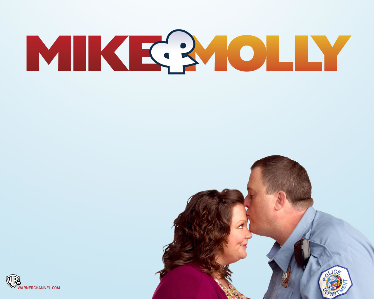 Description: A man and woman kissing in front of a blue background with the words mike and moly on it.