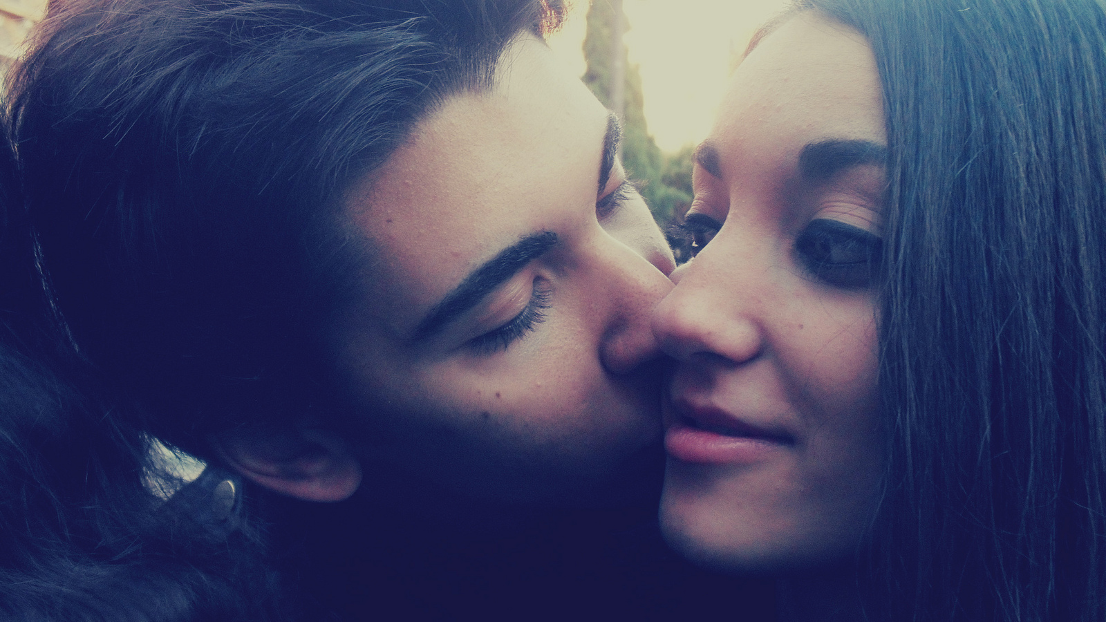 Description: A man and a woman kissing each other with their eyes closed and their noses close together.