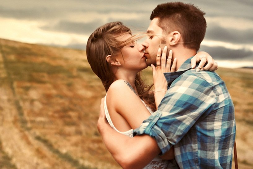 Description: A man and woman kissing in a field with a cloudy sky in the background and a dirt road in the foreground.
