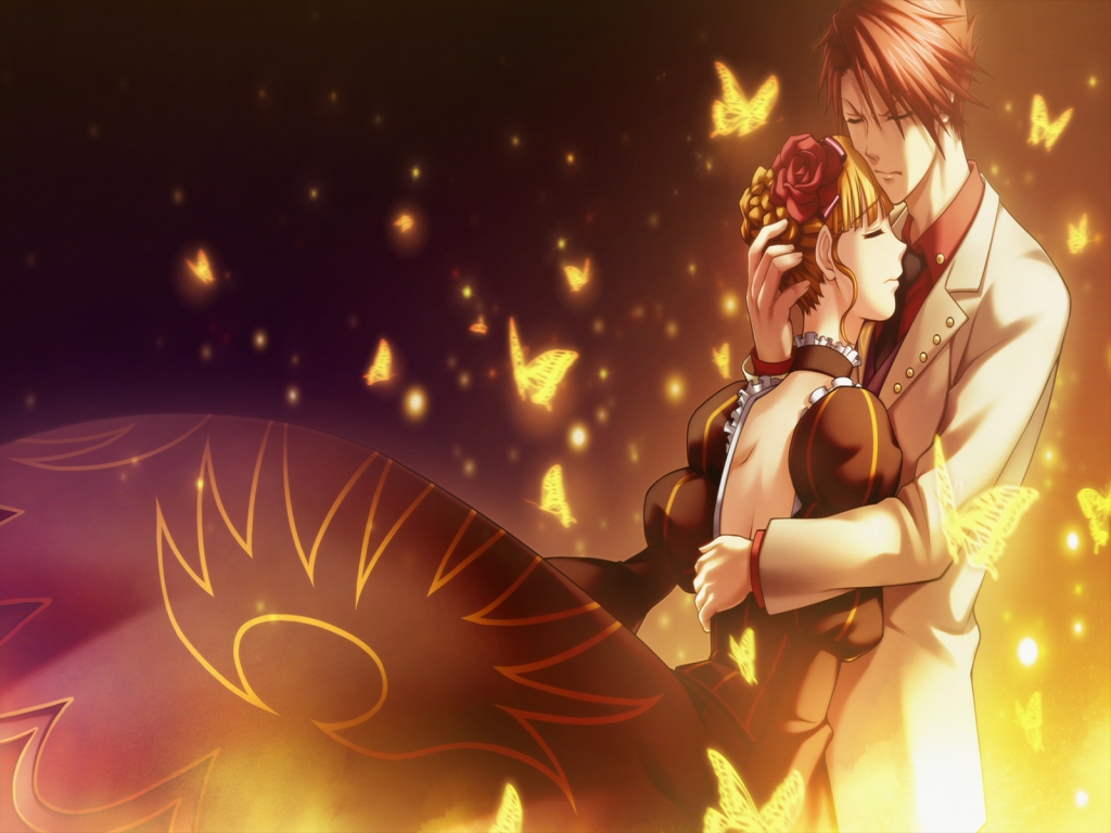 Description: A man and a woman are kissing in front of a fire with butterflies flying around them and a red rose in their hand.