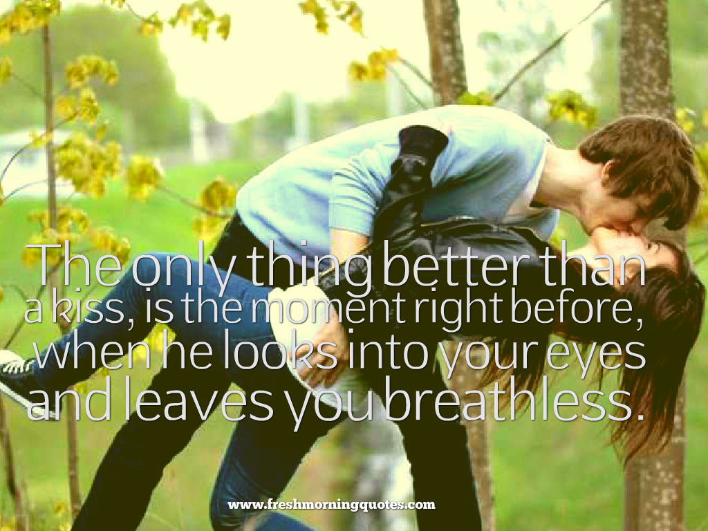 Description: A man and woman kissing in the woods with a quote from a woman on the back of them that says.
