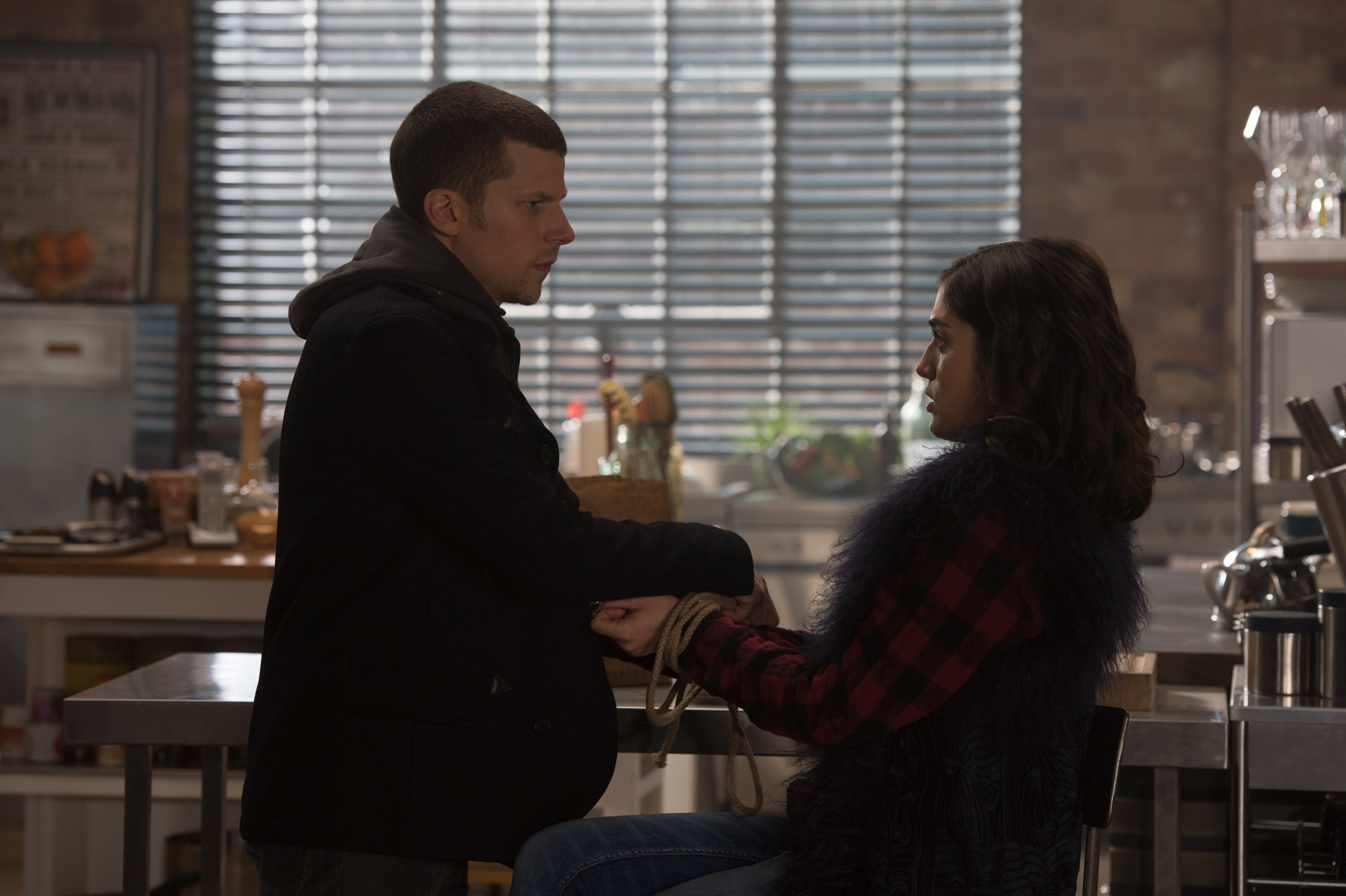 Description: A man and a woman standing in a kitchen talking to each other and smiling at each other's company.