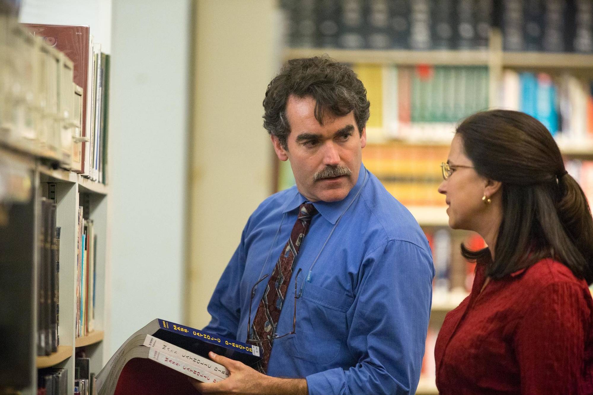 Description: A man and a woman standing in a library looking at books on a shelf and one man is holding a folder.