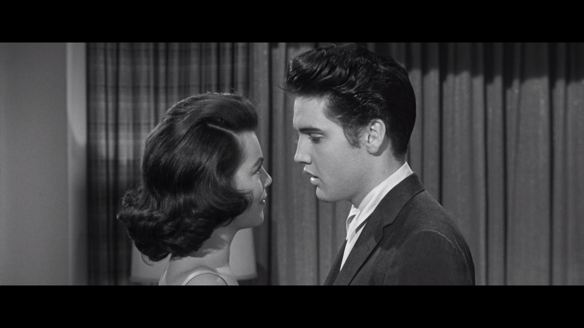 Description: A man and a woman are looking at each other in a black and white photo.