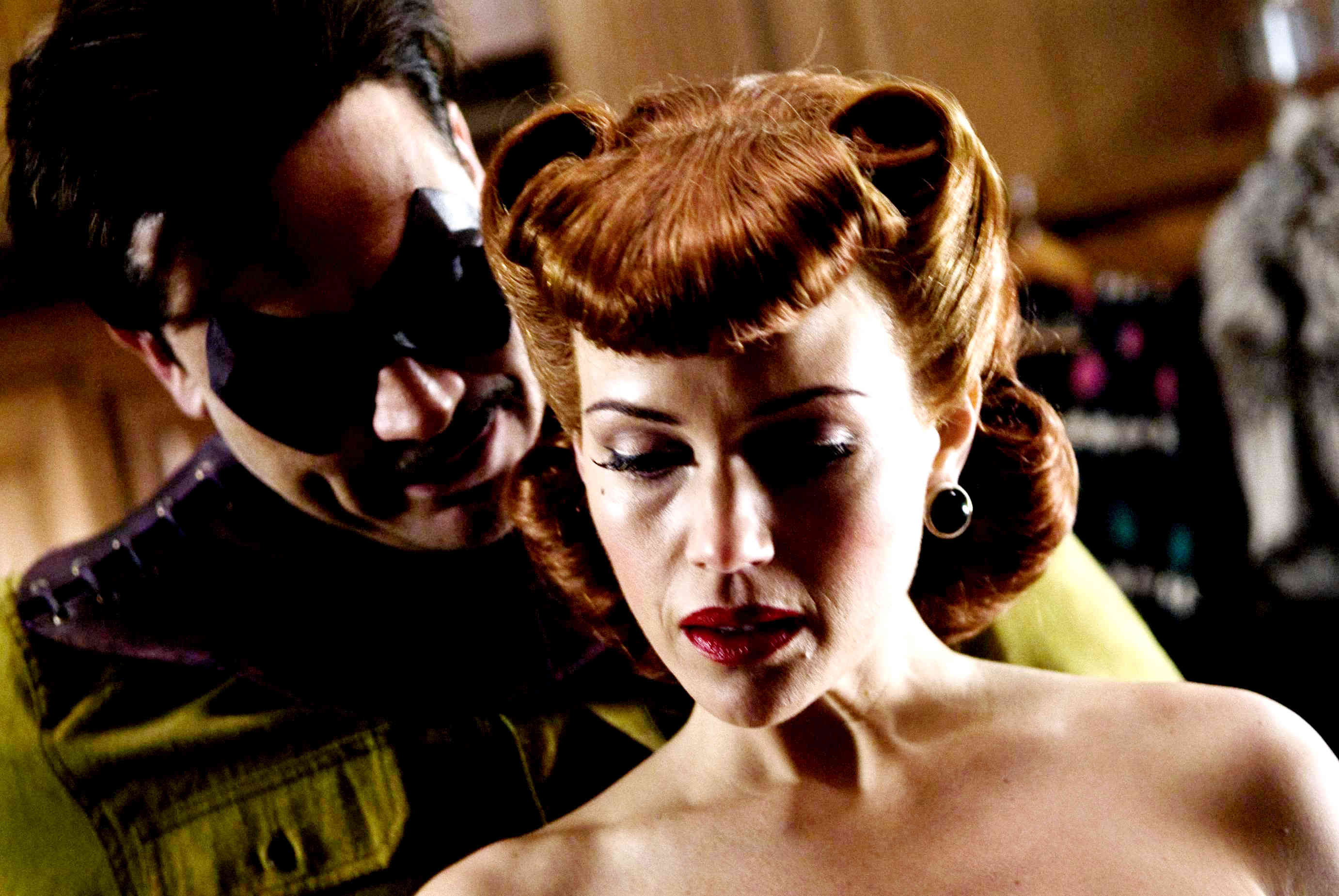 Description: A man and a woman are looking at a cell phone together in a room with a wall of mirrors.
