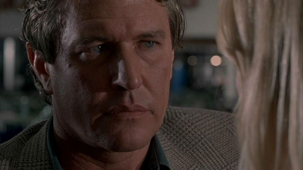 Description: A man and a woman are looking at each other in a room with lights on the wall behind them.