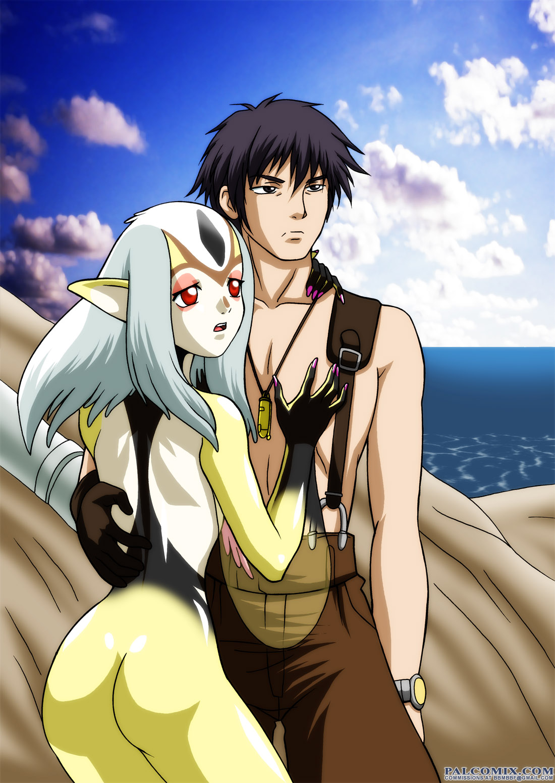 Description: A man and a woman standing next to each other near the ocean with a sky background and clouds in the background.