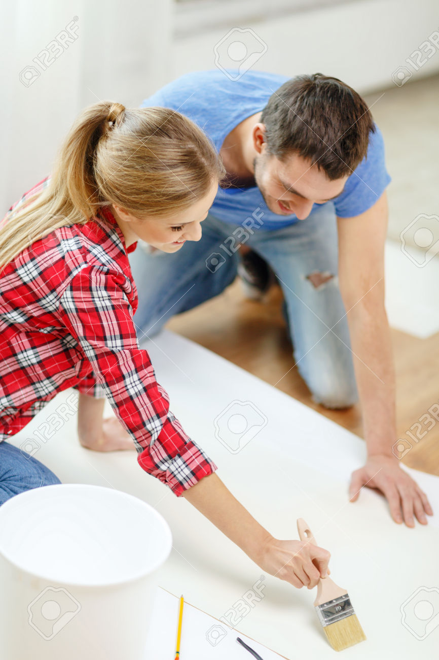 Description: A man and woman are painting a wall together stock photo - 959992.