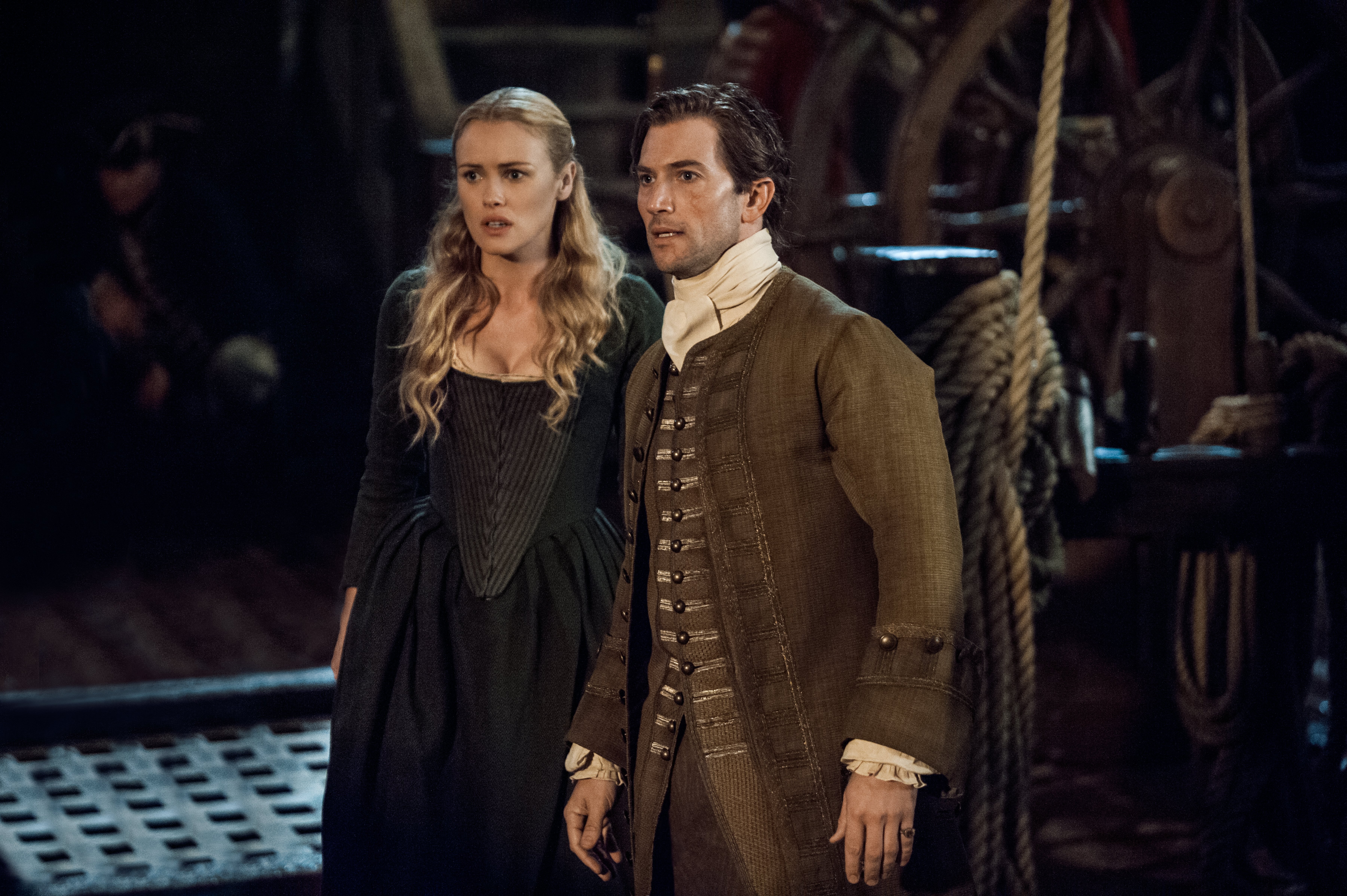 Description: A man and a woman dressed in period clothing standing next to each other on a ship in a dark room.