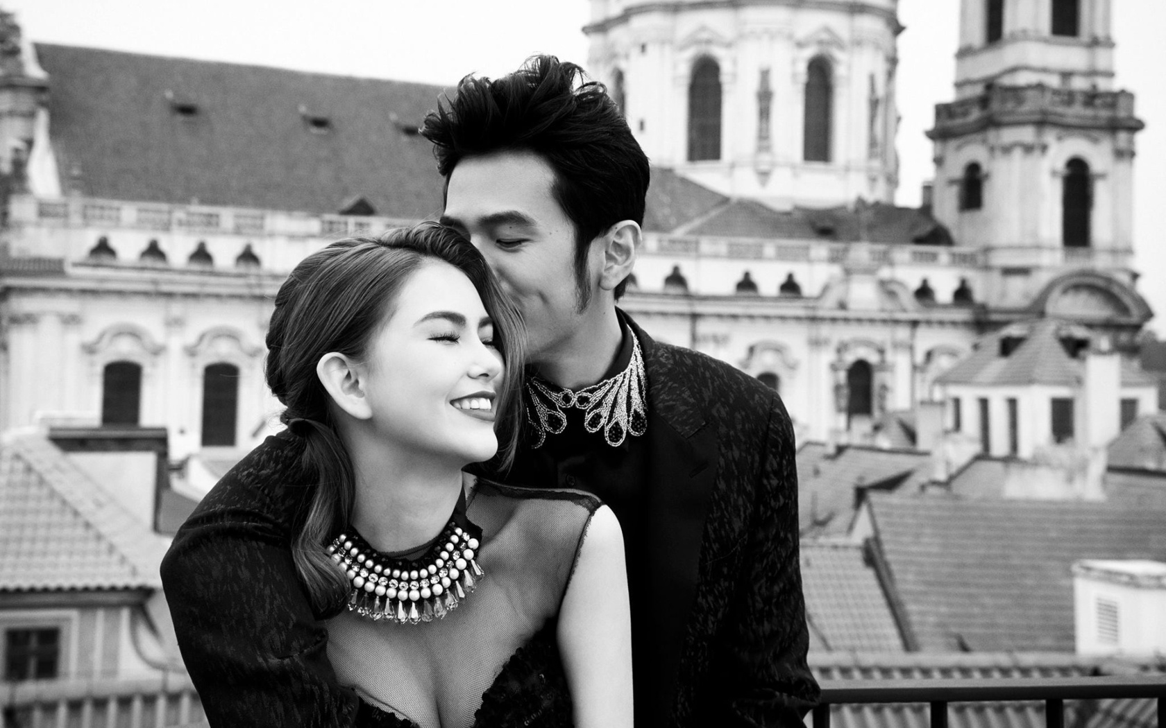 Description: A man and woman are posing for a picture in front of a building with a clock tower in the background.