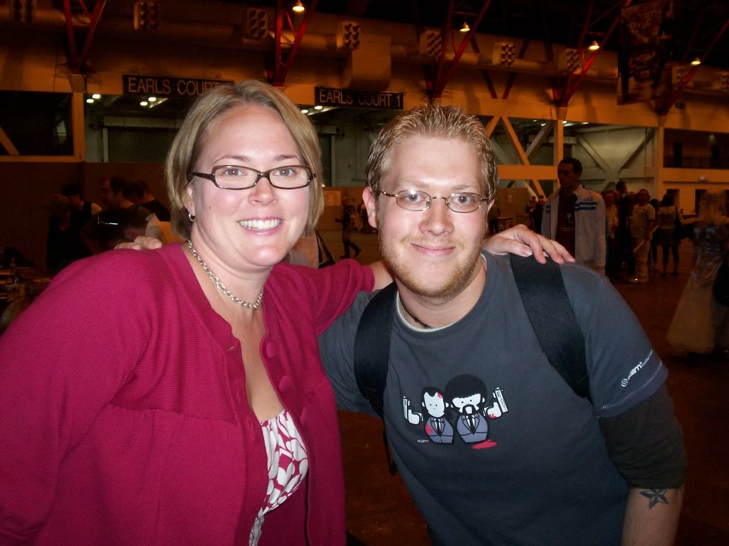 Description: A man and a woman posing for a picture in a building with people in the background and a sign hanging from the ceiling.