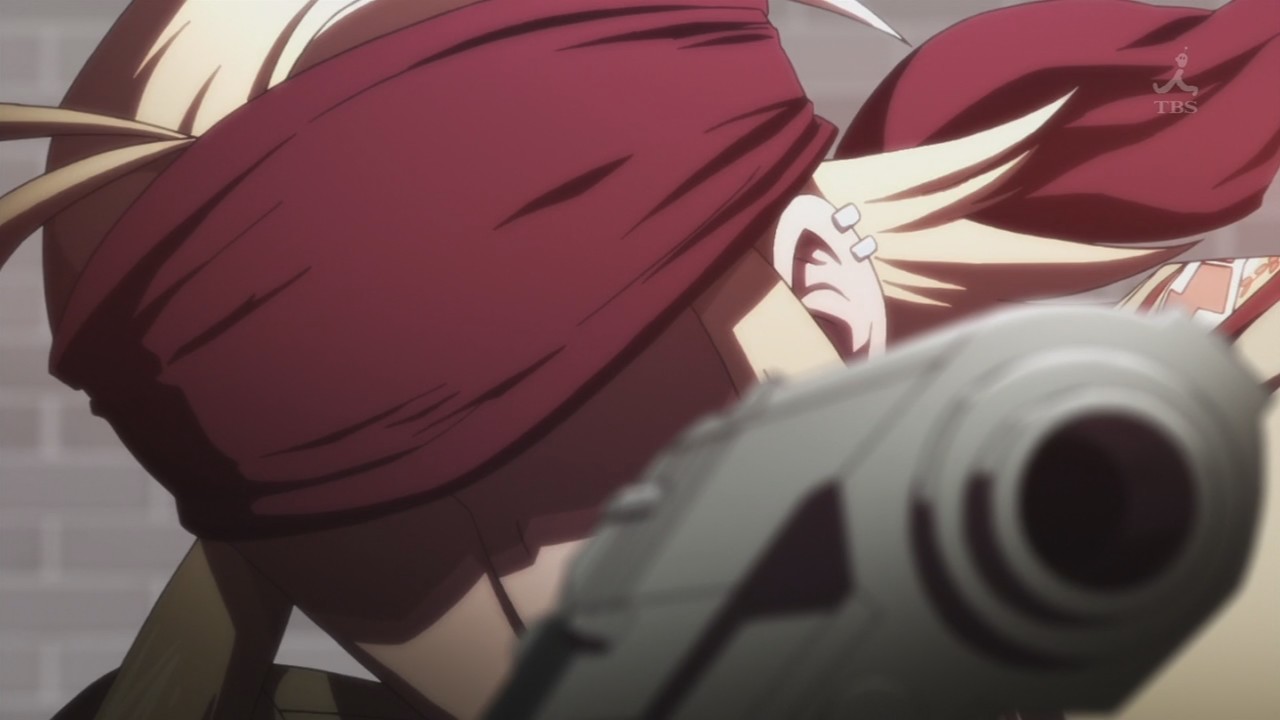 Description: A man with a gun and a woman with a red hair and a red dress are facing each other.
