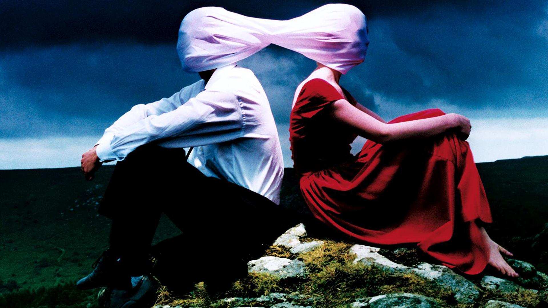 Description: A man and woman sitting on a rock under a cloudy sky with a sky background and a dark cloud.