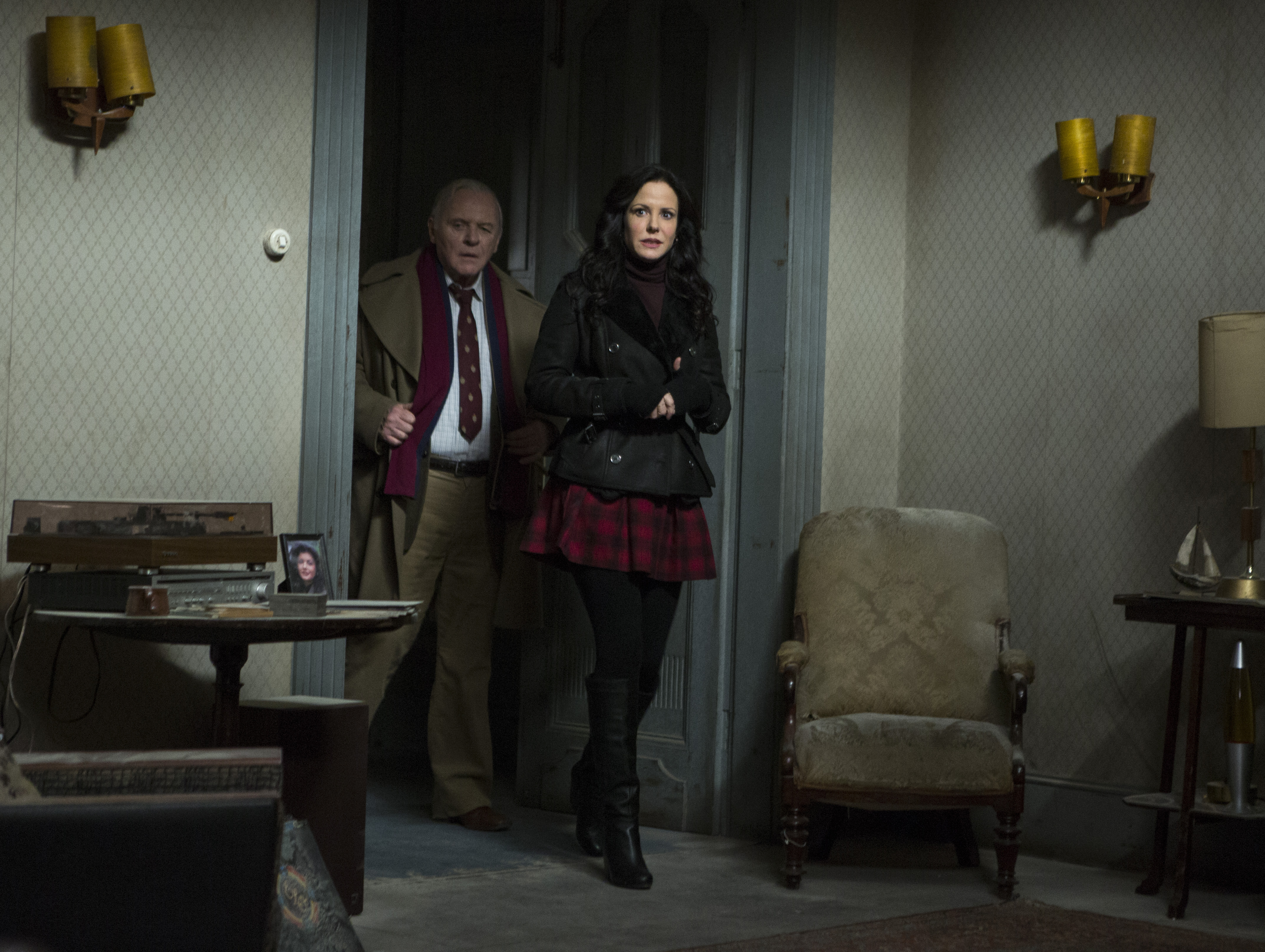 Description: A man and a woman standing in a room with a door open and a table with a lamp on it.
