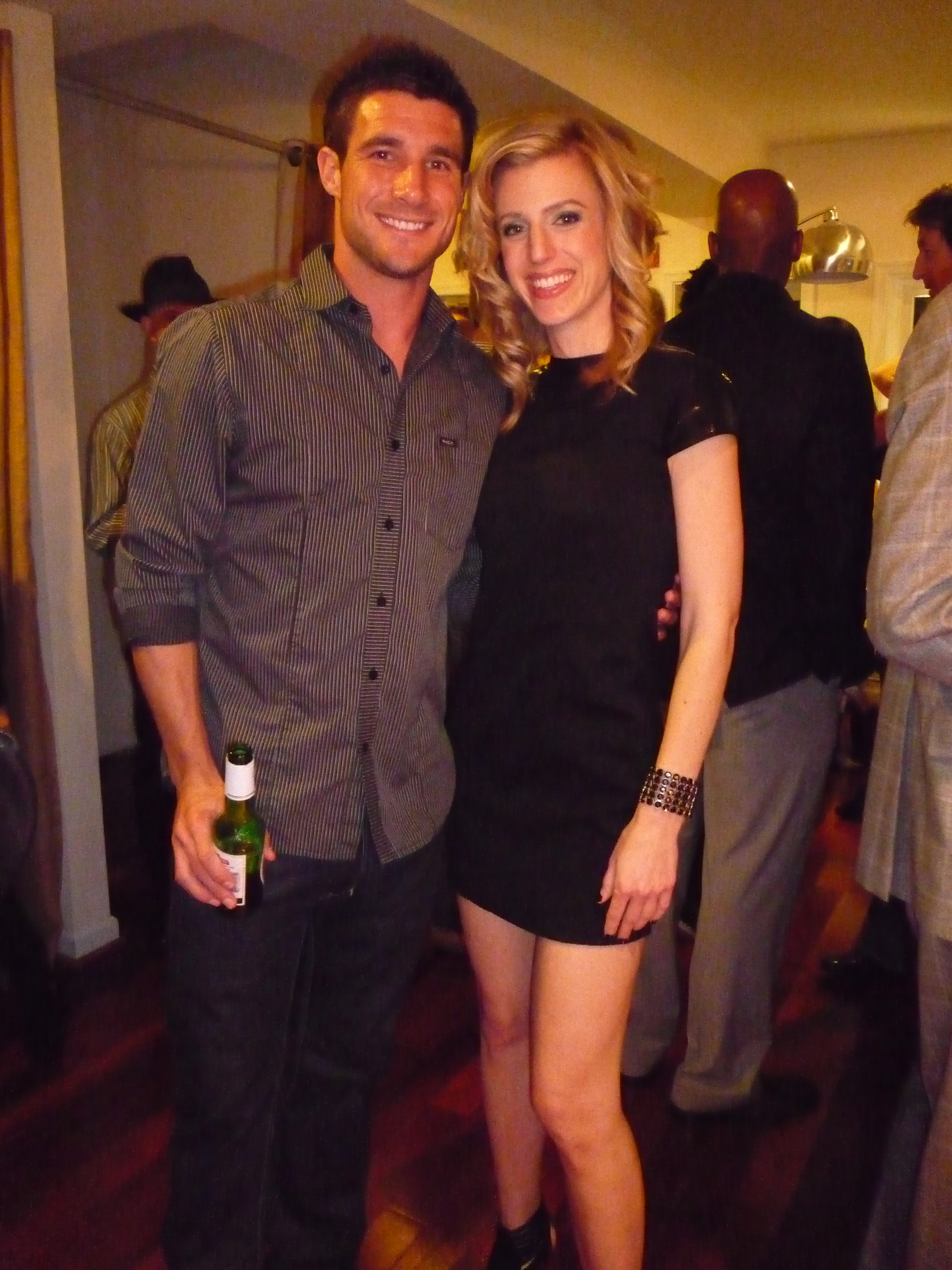 Description: A man and a woman standing next to each other in a room with people in the background and a beer bottle in the foreground.