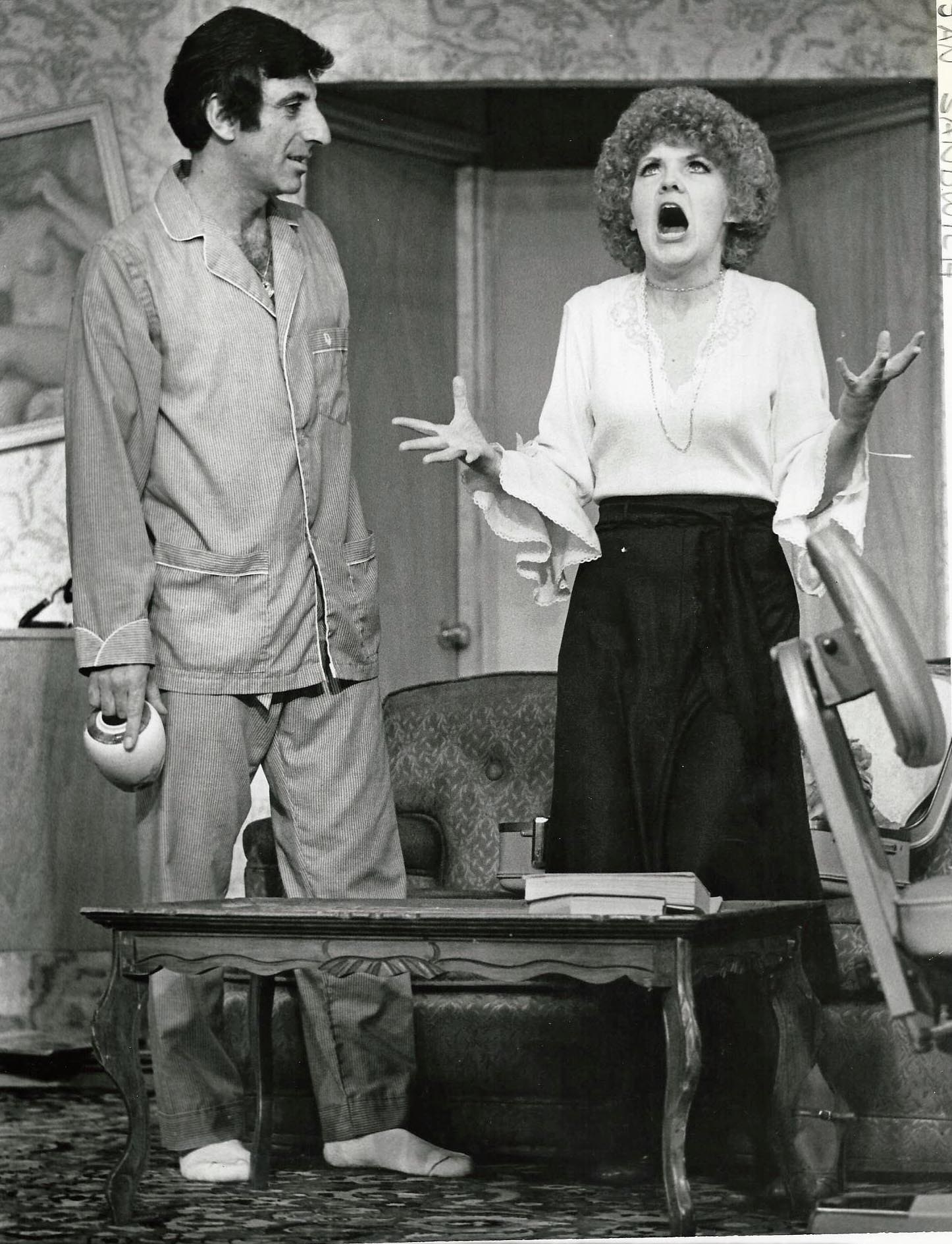 Description: A man and a woman standing in a room with a table and a chair in front of them and a man holding a microphone.