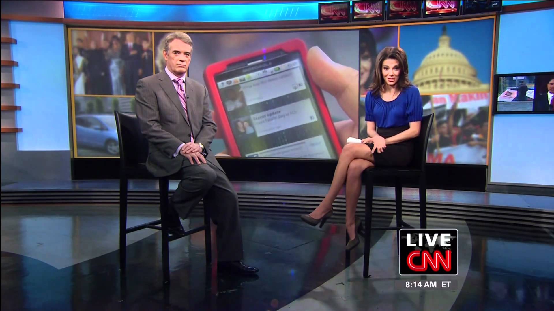 Description: A man and a woman sitting on chairs in front of a tv screen with a news anchor on it.