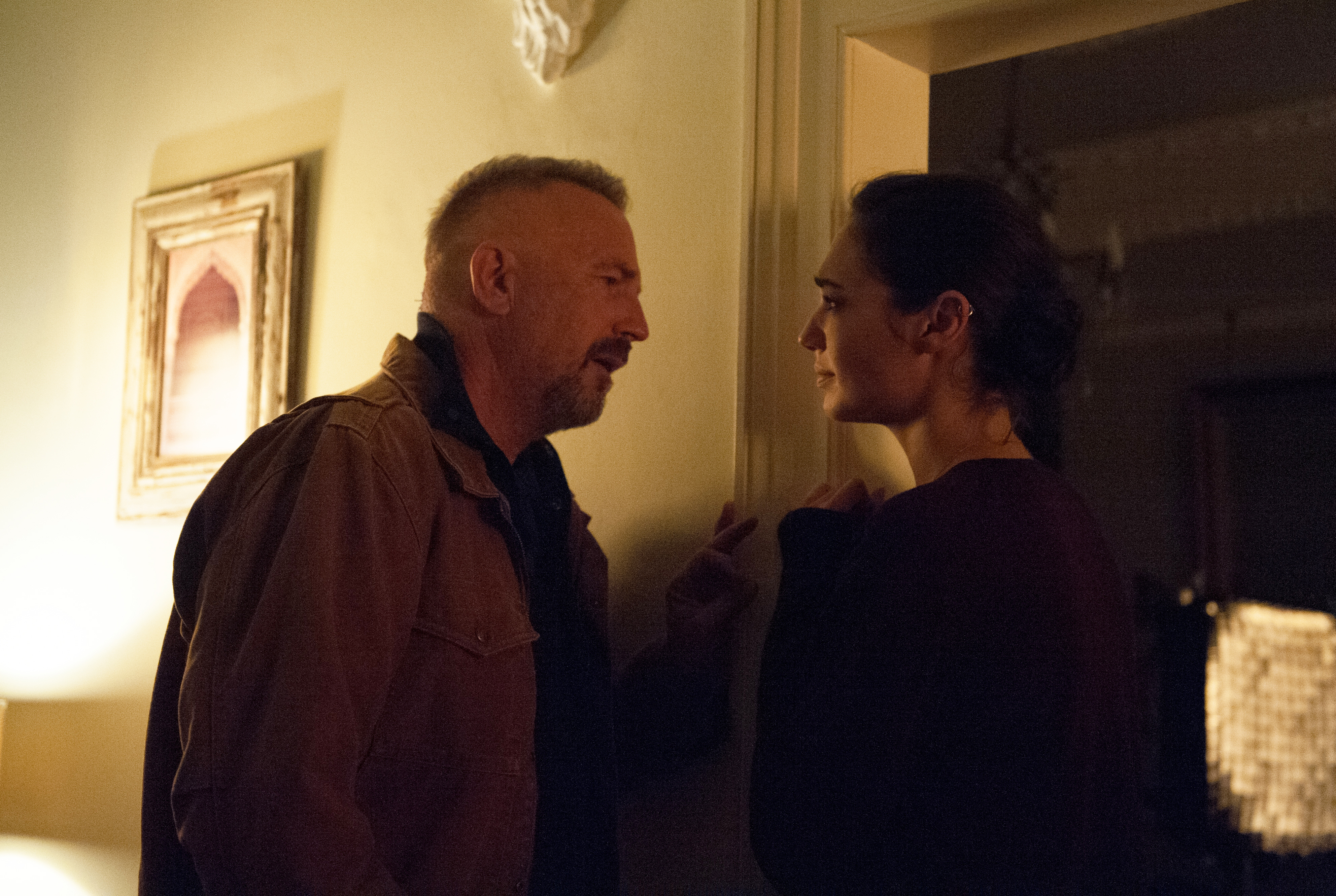 Description: A man and a woman standing in a room together looking at each other and smiling at each other with a light on.