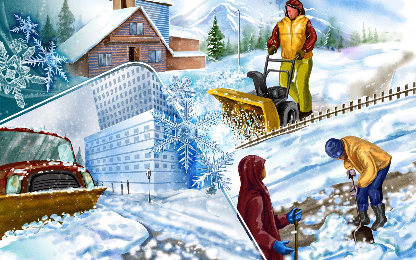 Description: A painting of a man with a snow blower and a woman with a snow blower in the snow.