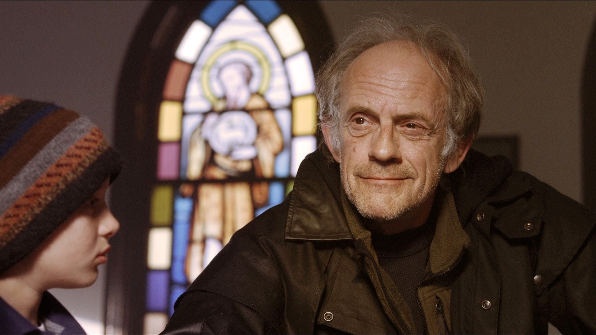 Description: A man and a woman sitting in front of a stained glass window with a man in a hat on.