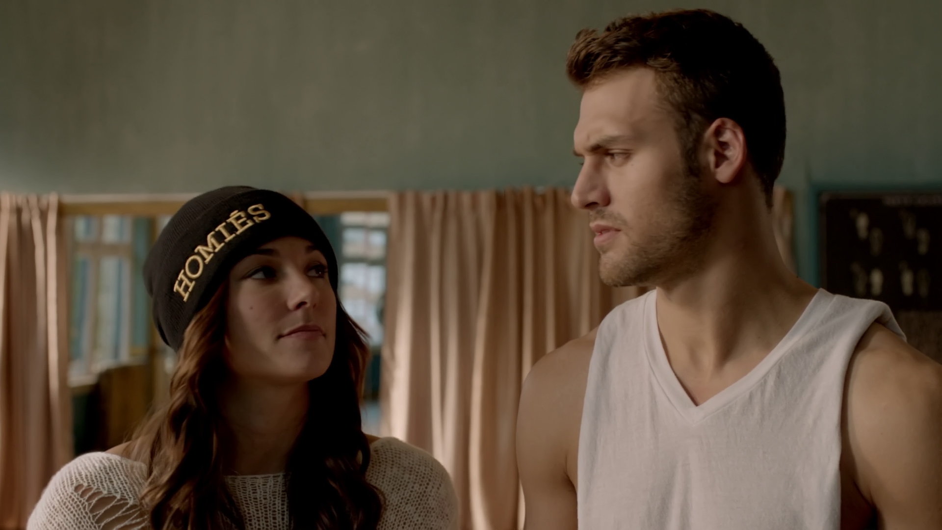 Description: A man and a woman standing in a room with curtains and curtains behind them.