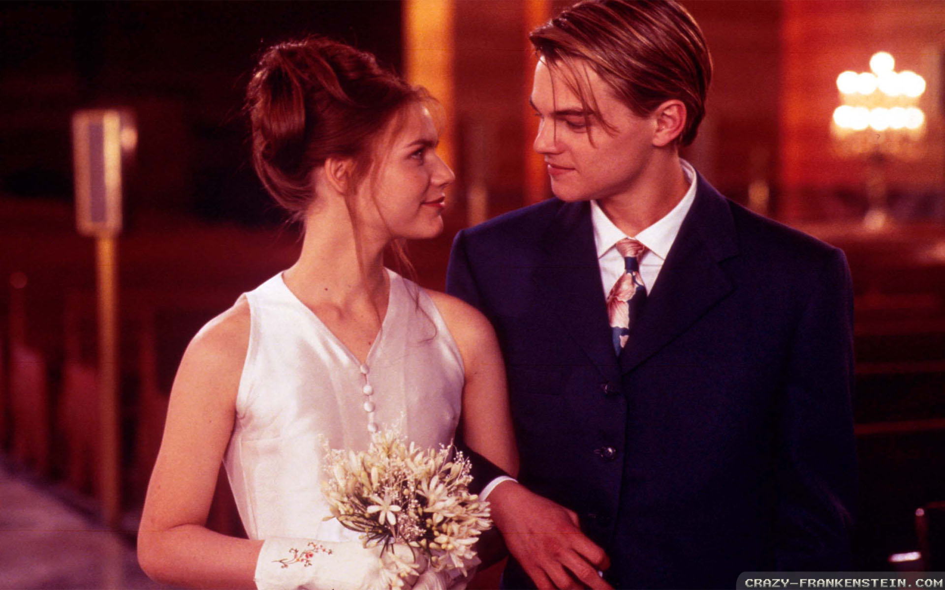 Description: A man and a woman standing next to each other in a room with lights on the ceiling and a chandelier.