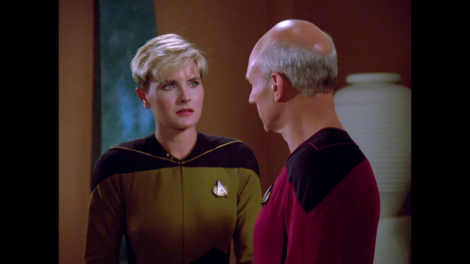 Description: A man and a woman standing next to each other in a room with a vase on the wall behind them.