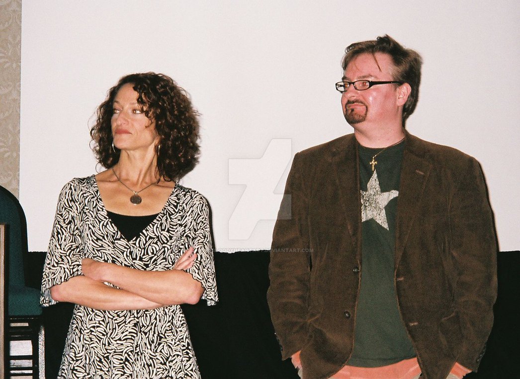 Description: A man and a woman standing next to each other in front of a screen with a star on it.
