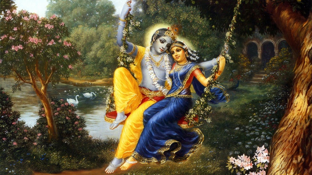 Description: A painting of a man and woman on a swing in a park with flowers and trees around them.