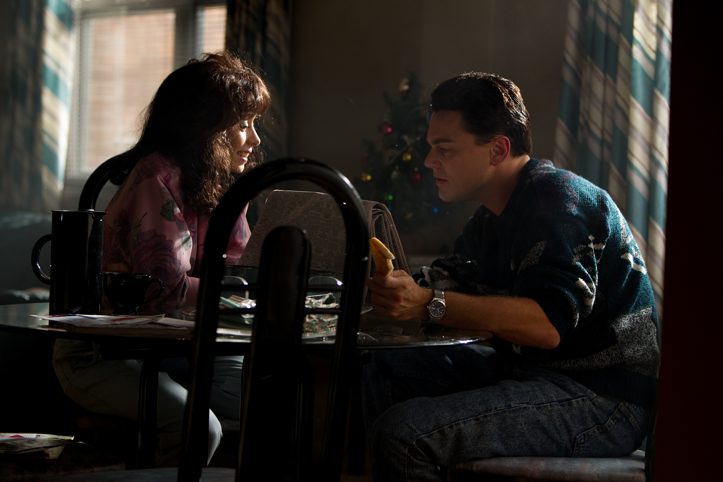 Description: A man and a woman sitting at a table with a banana in their hand and a christmas tree in the background.