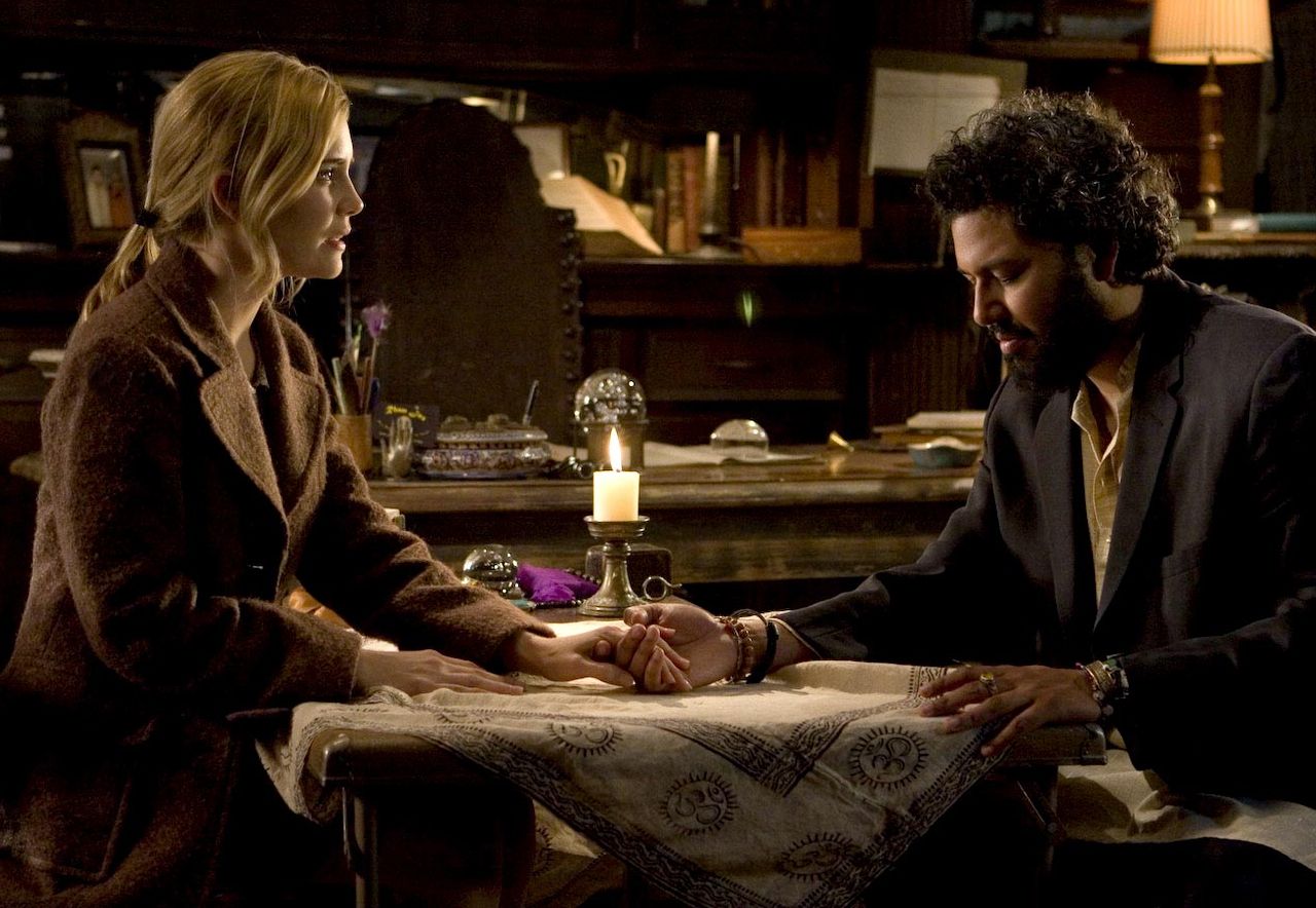 Description: A man and a woman sitting at a table with a candle in the middle of the table and a table cloth on the table.