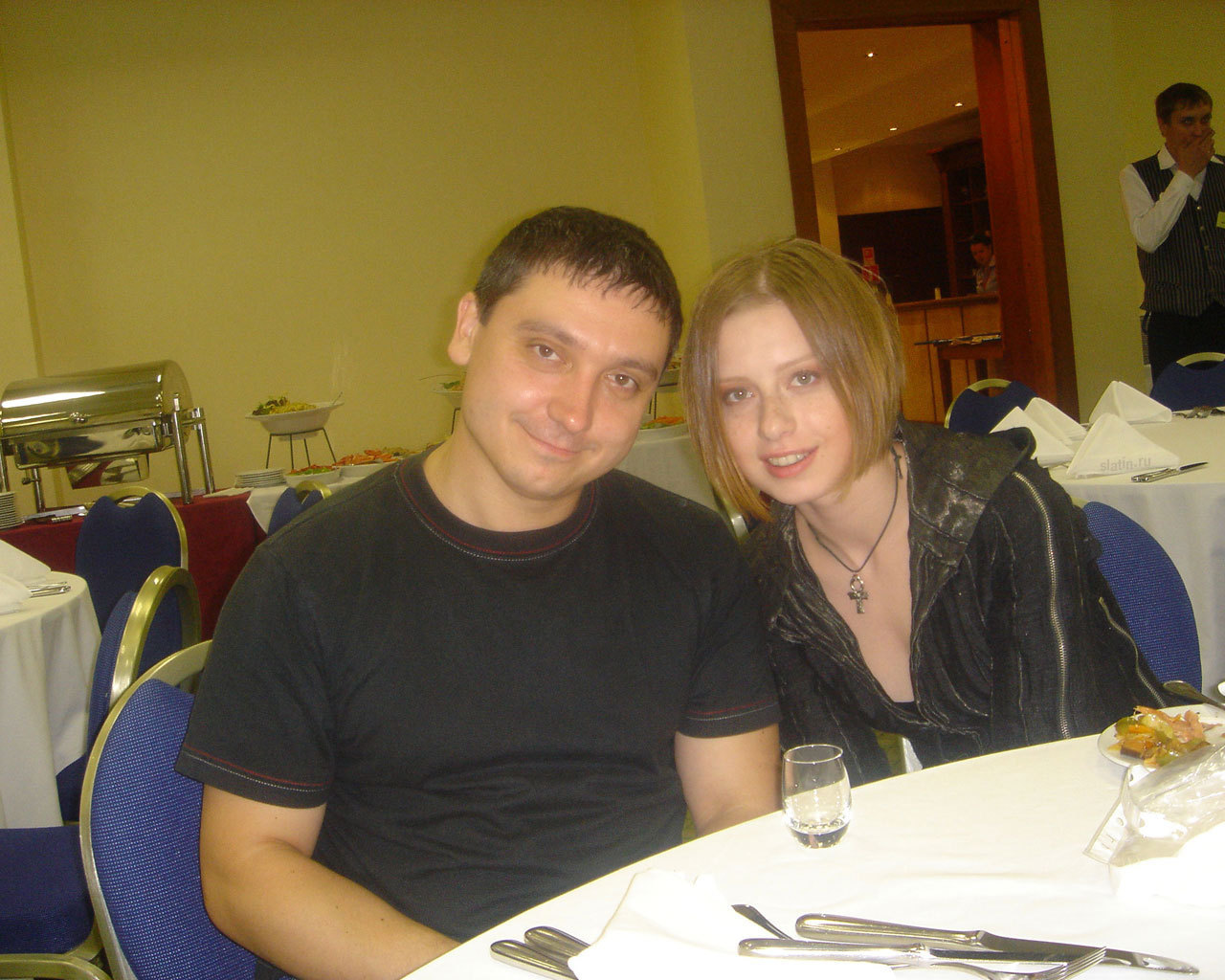 Description: A man and a woman sitting at a table with a glass of wine in front of them and a man in the background.