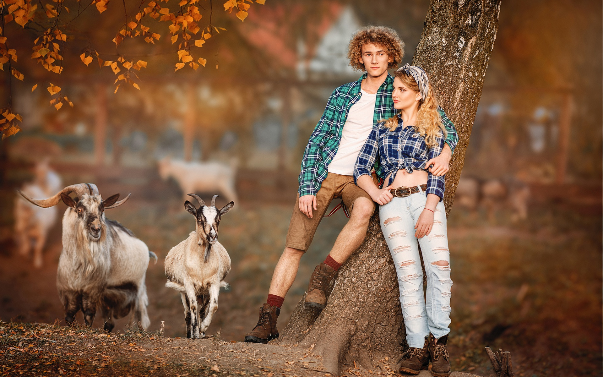 Description: A man and woman sitting on a tree with two goats in the background and a man standing next to them.