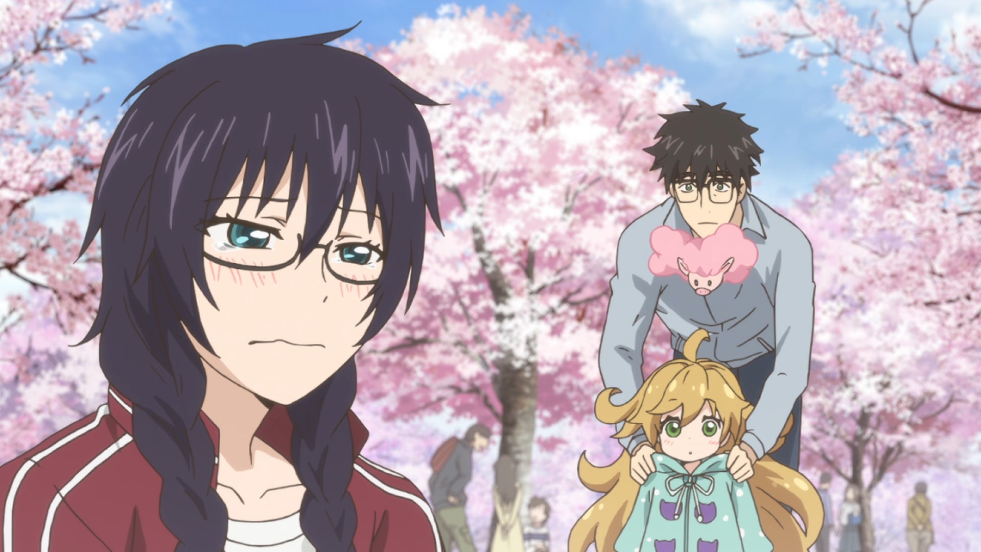 Description: A man and a woman standing in front of a tree with pink flowers in the background and a man holding a heart shaped object.