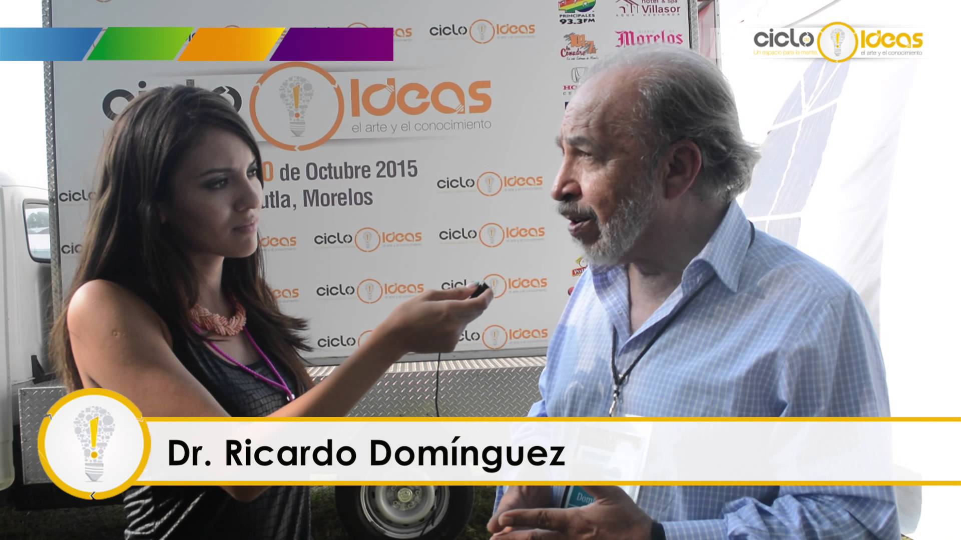 Description: A man and a woman are talking to each other in front of a truck with a sign behind them.