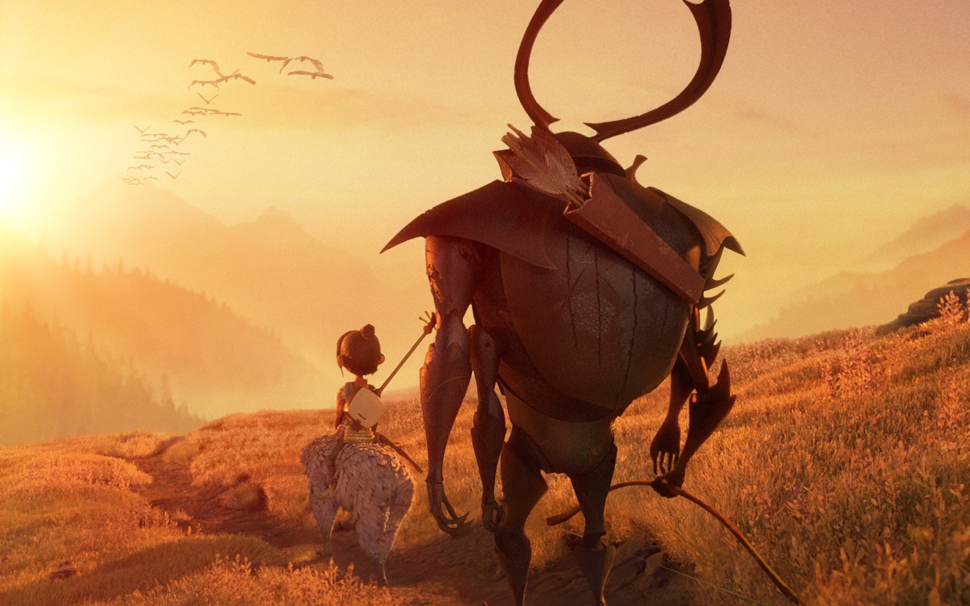 Description: A man and a woman walking down a hill with a giant animal on their back and a dog on their back.
