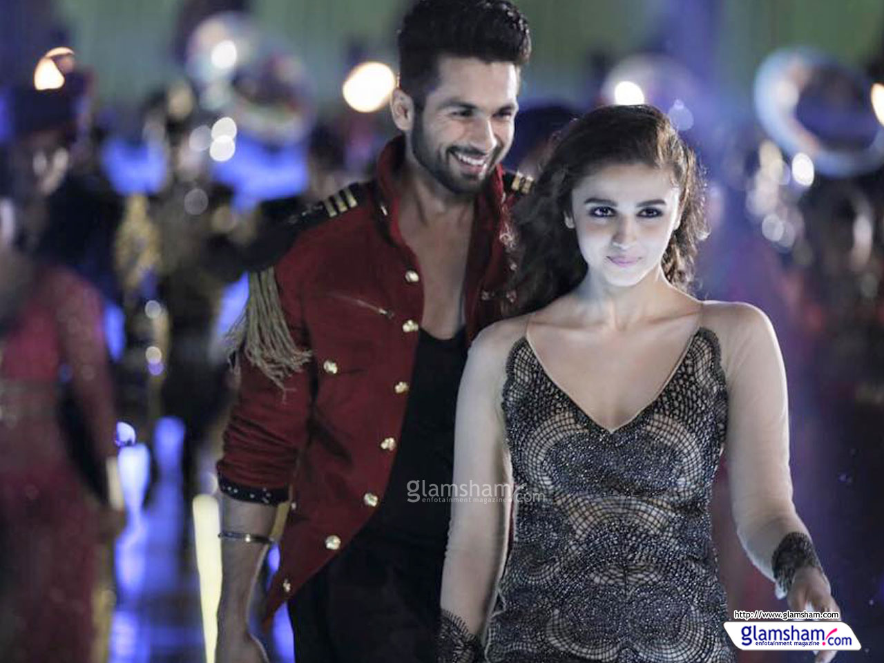 Description: A man and woman walking down a runway together in a showroom with a man in a red jacket.